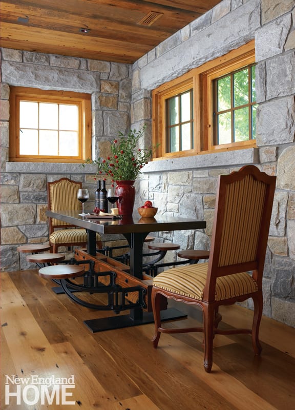 To reinforce that notion, he repeated the exterior siding inside, banishing all drywall and covering the floors and ceilings with reclaimed oak and chestnut. State-of-the-art lighting and climate control systems lurk beneath these historic trappings, assuring year-round comfort and ease. “We basically made a modern structure and skinned it inside and out with antique materials,” notes builder Jeff Andrews.