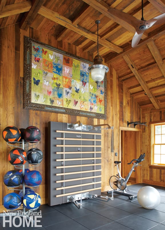 “I’ve always liked art and always collected art,” says the owner, who acquired a number of pieces for the barn, including a trio of works by celebrated neo-Expressionist Hunt Slonem. The most imposing one, surprisingly enough, hangs above a resistance-training machine in the gym. “I really liked it, but never had a space for it,” he says of the six-by-nine-foot canvas, which lingered at Norwich’s Galerie SoNo for more than a year while he deliberated. “One day, I looked up in the gym and thought, ‘Hey, I could put it right there!’ ” He went out and bought the piece that same day. “I like it,” he muses. “To me, a gym has got to be a space you feel good in.”