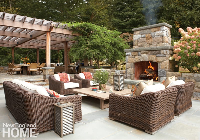 The project was assigned to architect Mark P. Finlay, who decided to nestle the 4,200-square-foot structure deep into its steep, hillside site, so that the ground floor opens onto an auto court in front and the second floor adjoins an elevated terrace and pool out back. A tapestry of pillowed Connecticut fieldstone covers one wing of the T-shaped structure, while the other is finished in dusky antique barnboards. “I wanted it to look like it might have been an old stone outbuilding, and then they added a barn structure to it over the years,” says Finlay, who was assisted on the project by Jay Valade. “The main idea was to make it look like it had been there forever.”