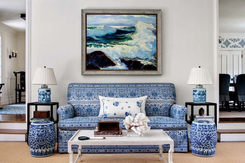 Many of the owners’ furnishings had gone along with the sale of their old house, so they were starting almost from scratch. Blue and white—a crisp white with no antique-y yellow undertones—is the wife’s favorite combination. With those colors as the theme, De Bastiani wasted no time layering the airy rooms with furniture, art and accessories that conjure thoughts of the sea.