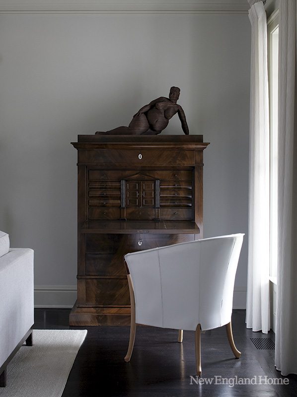 One such piece graces the living room. Two long, white sofas sit facing one another in front of the fireplace, but it is a walnut secretary against a gray wall that garners most of the attention.