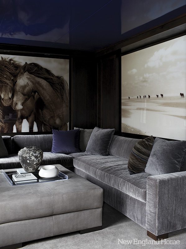 “We wanted to do a media room with a wood paneling, but not a traditional media room,” says Silver. “Lacquering the ceiling and wall gave a contemporary edge to the room. It’s a nice balance. It’s not so dark and heavy. The lacquer reflects and lights the walnut paneling.”
