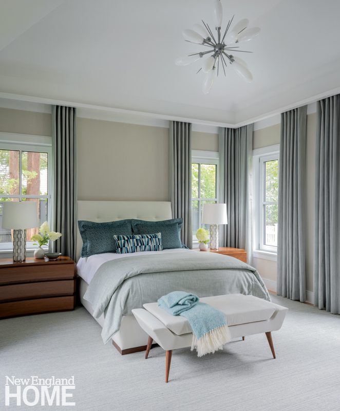 Inside, the design reflects the homeowners’ commitment to efficiency—energy and otherwise. The empty-nest couple primarily occupies the first-floor living room, kitchen, and primary suite, reserving the four second-floor bedrooms for guests. “With limited space, function is key,” says interior designer Leslie Fine. “Every room has a use, which mimics the idea of net-zero.”