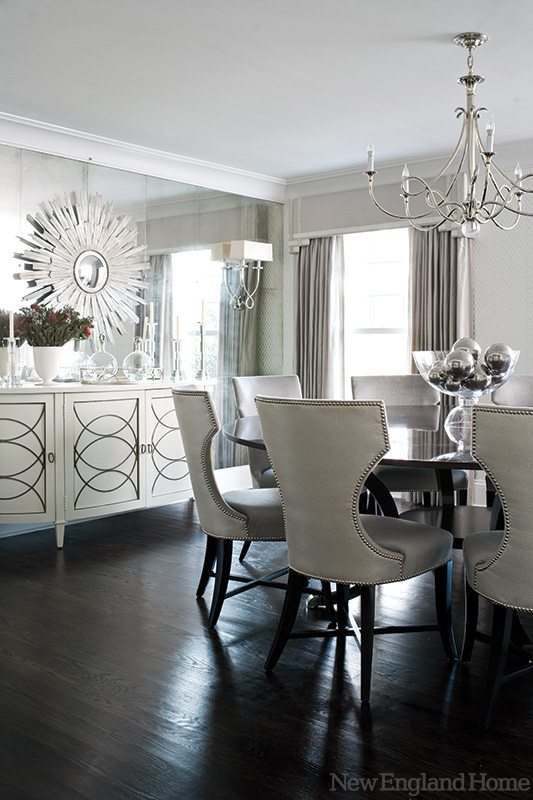 The dining room, for example, is layer upon layer of sparkle and shine: a large starburst mirror hung on an antique mirrored wall; iridescent silver wallpaper peeking from beneath the luster of large-scale Asian artwork; the sheen of gray silk drapes topped with a valence accented by silver tape; gray mohair dining chairs whose hues change with the light; and chrome, crystal and glass accessories of all sizes catching and casting reflections around the room. When it comes to entertaining, the room is a definite crowd pleaser, and the custom round table can easily accommodate a dozen guests for dinner parties.