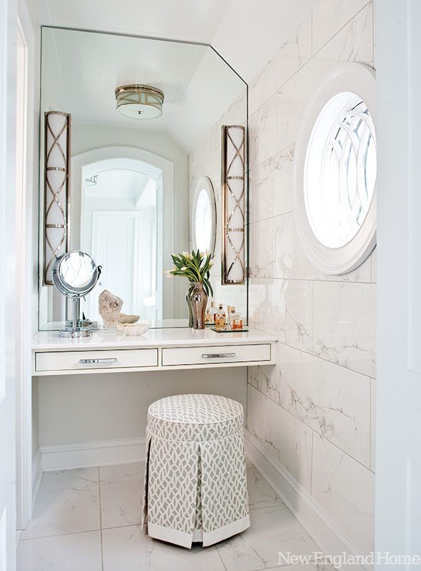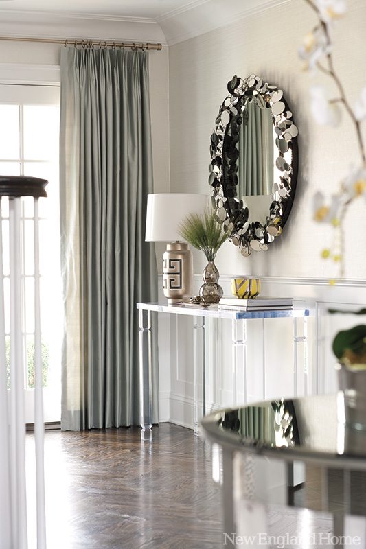 Morgan Harrison, a former fashion editor for ELLE and Mirabella, turned to her roots to find inspiration for the interior palette, talking with Kate about her favorite colors when it comes to clothing. Kate’s penchant for white, cream, light blue and silver apparel—along with the occasional pop of yellow—is reflected in color choices. The overall calming palette has a definite “wow” factor, with crystal chandeliers, frosted glass, Lucite, mirrors and shiny silver chrome glittering throughout the house. “It just adds a lot of life to a room and ups the glamour factor in a really beautiful way,” says Morgan Harrison of her fondness for reflective surfaces.