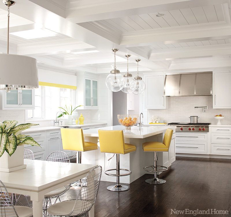 Horizontal paneling wraps kitchen walls and joins the space to a small adjacent office, a cozy nook Kate loves. Interior millwork throughout the house also nods to a more contemporary aesthetic; MacMillan favored flat panel work, as opposed to raised panels, and cove crown molding with a simple, clean arc, rather than the ornate crown found in more traditional homes. “This house is an interesting blend,” notes MacMillan. “The outside is very traditional, but the inside trim work, millwork and decorating style has a modern flair.”