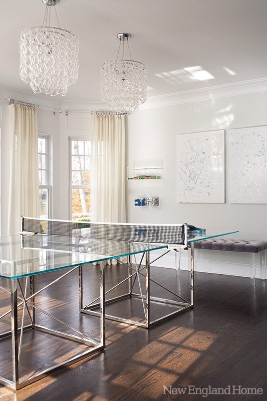 Inside, interior designer Michelle Morgan Harrison, of the New Canaan–based firm Morgan Harrison Home, revamped the interiors with a decidedly modern flair. Kate, trained as a nurse, wanted things to be kept simple yet beautiful—not to mention easy to clean as she’s also the mother of three children under the age of twelve. Spaces suitable for easy entertaining was another important consideration as was—a somewhat more surprising request—a room to house a ping pong table. (Table tennis is one of the family’s favorite pastimes.)
