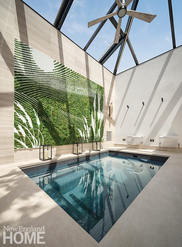 Robin had her heart set on a spa-like sanctuary within the home, so the team reimagined the courtyard and existing greenhouse. The greenhouse floor was lowered and an in-ground plunge pool—an anomaly in the middle of the city—installed. And a preserved-moss mural, designed by Florida-based Plant the Future, connects the interior’s focus on artwork with the outdoors. The mural, says senior designer Christine Rankin, was another element Robin brought to the design. “She’s really attracted to things she’s never seen before,” Rankin says. “She doesn’t want what other people have, and that’s so exciting.”
