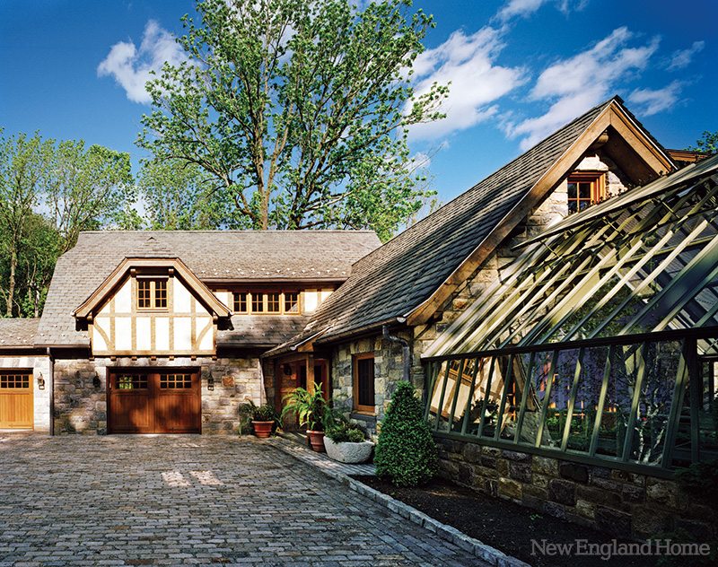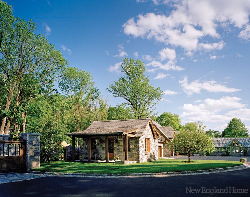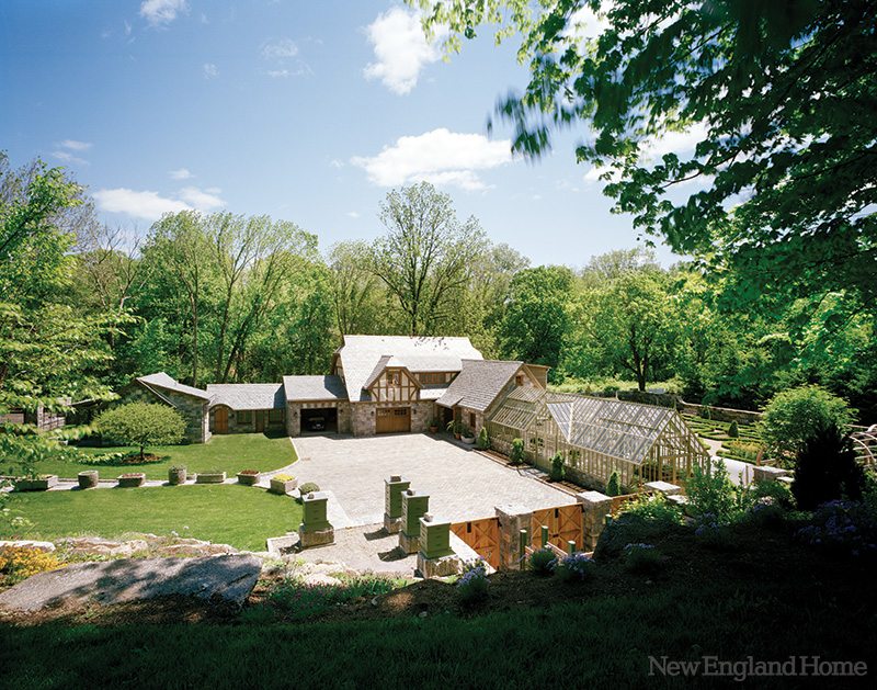 Today a working farm once again stands on the eleven-acre estate, forming the core of a varied, beautiful landscape. Stick designed a master plan with the passionate gardener/homeowner that encompasses elements the original farmer surely would have envied: a large English greenhouse adjoins a generous, well-equipped potting shed, which, in turn, abuts the garage, guest quarters and home office. The compound, which used and expanded on existing farm buildings, forms a U around a paved courtyard. Picturesque with granite foundations and half timbering, the buildings and the garden wall at one corner form the boundary of one of Greenwich’s charming country roads.