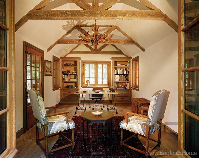 Hilton was inspired by the little hamlet Marie Antoinette had build at Versailles, he says. “We translated it to Connecticut with granite instead of limestone, and slate on the roof instead of thatch. Though the timbers were mill-sawn, the workmen used old adzes to make them look hand-hewn. The aesthetic is very French.”