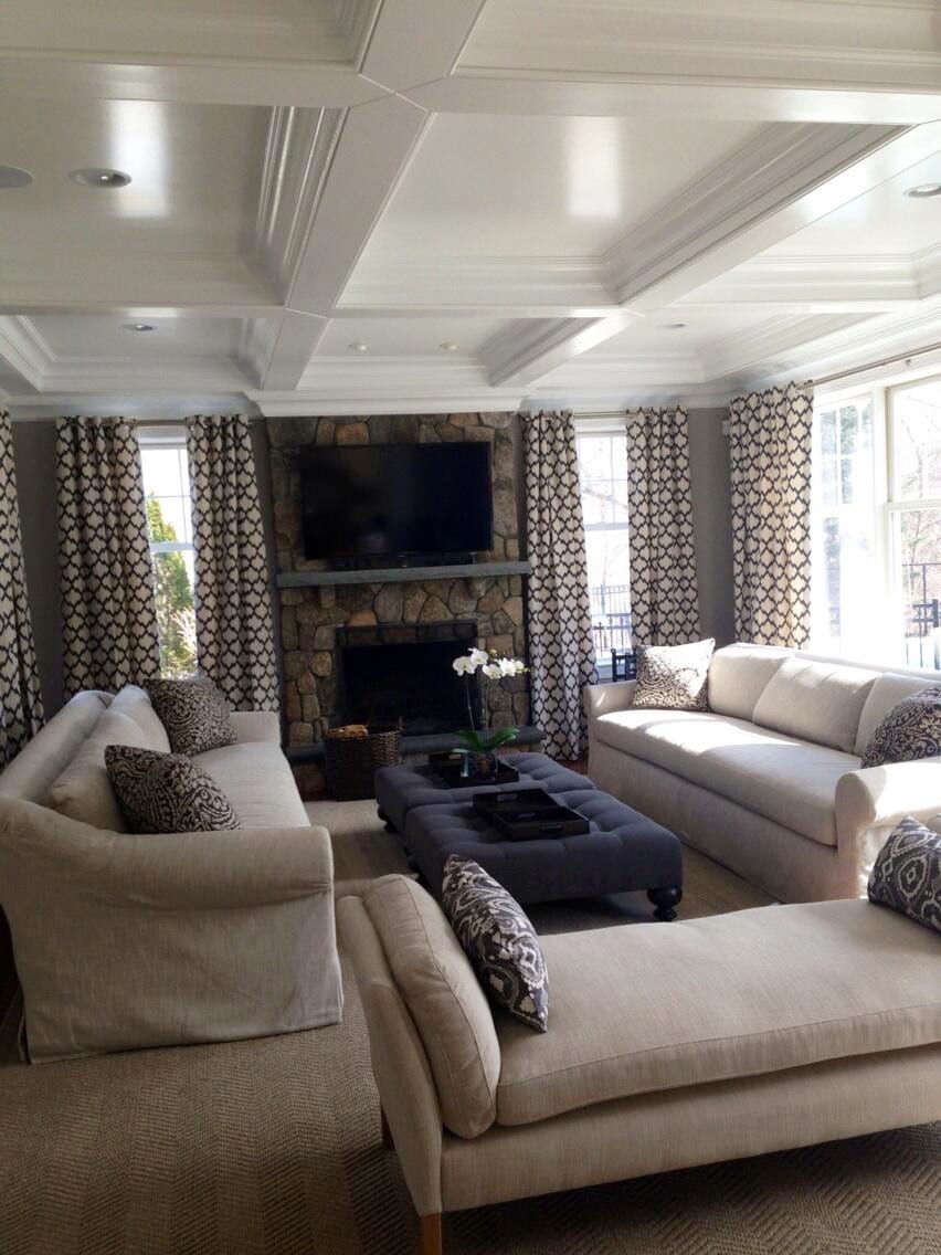 The client wanted a coffered ceiling and a raised, natural stone fireplace so that you could see the fire from the adjoining kitchen. For the color scheme we referenced some of the natural materials used outside by the pool. We specified a black/brown/grey stain for the wide plank white oak flooring and a crisp white paint to highlight the coffer detail on the ceiling. This allowed us to paint the walls a warm grey tone to balance it out. For the furniture layout we looked at several layouts using sectionals and sofas but settled on two twleve-foot-long sofas flanking the fireplace, as it allowed us to create two different seating zones as the room was so long and narrow. We then chose two wing chairs on the opposite end of the room, flanking the wide doorway, creating a second conversation area with a large bench/chaise bridging the two different seating areas.