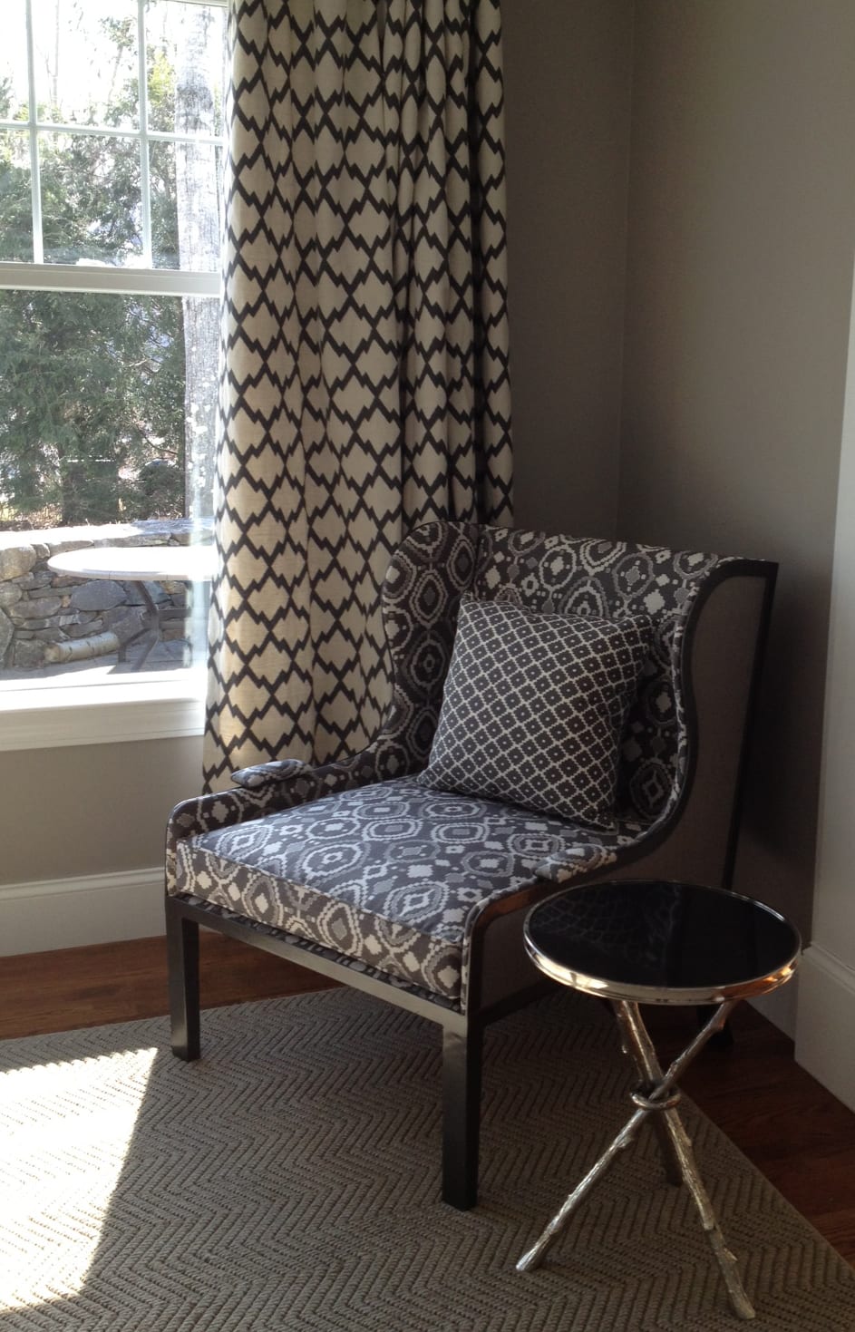They can be replaced years down the road when the kids are older with possibly a pair of square wood coffee tables. The price point of the ottomans also allowed us to balance out the cost of two custom, hand-made, blackened steel and upholstered wing chairs from Casamidy in Mexico. We specified these chairs (pictured here) with a solid wool fabric from Zinc for the back and a patterned Romo fabric for the inside and seat cushion creating a one-of-a-kind look that we were all thrilled with. An inexpensive nickel and stone-topped tripod table is the perfect place to place a book and/or drink. Once we add artwork with picture lights and accessorize a long row of bookcases (not shown) the room will be complete for fall entertaining and enjoyment.