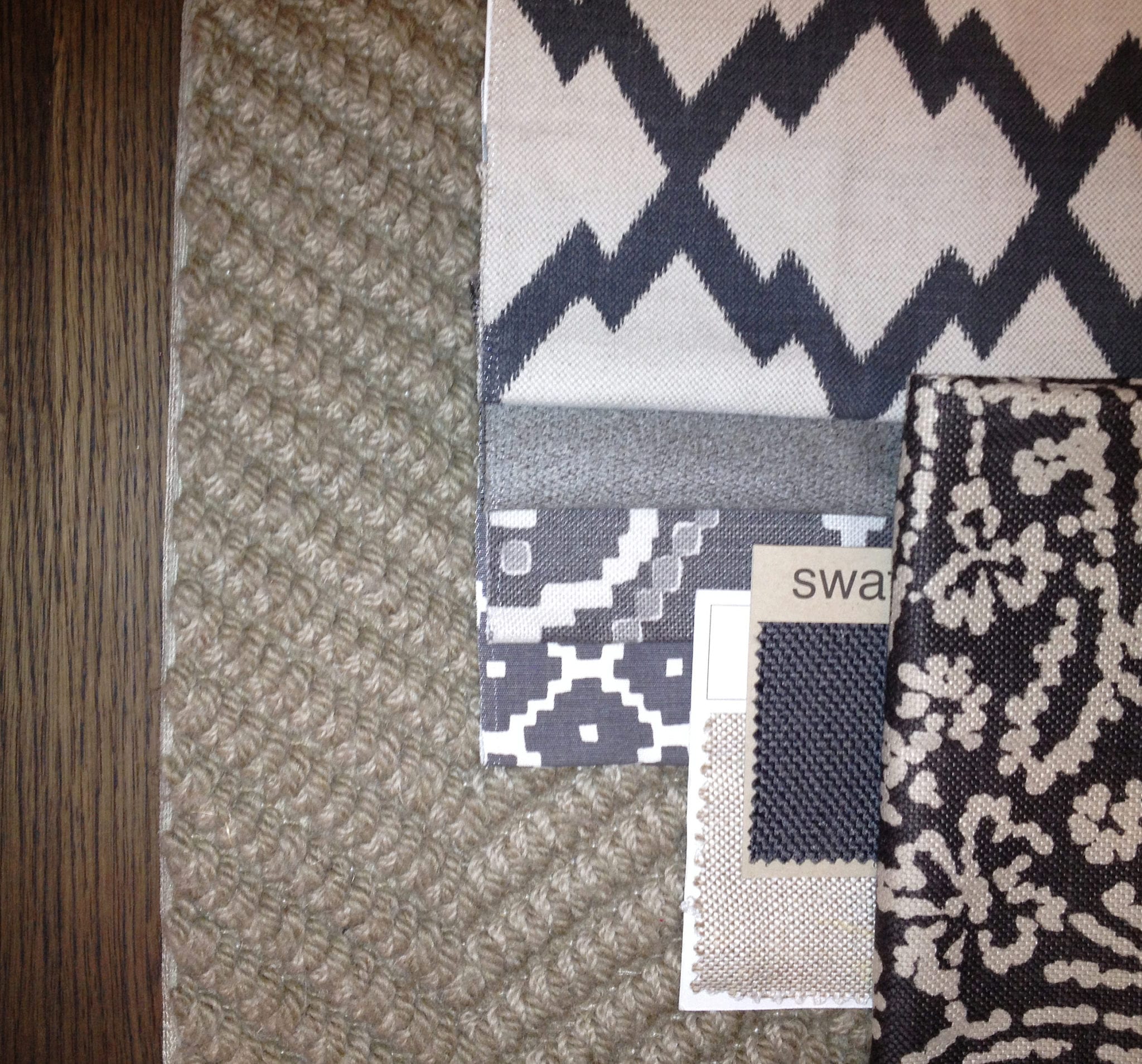 When it came to furnishings, we started out with knowing the young clients wanted some kind of bold statement, so we decided to use a bold, trellis-patterned drapery with casual grommeted headers on nickel-plated rods. We chose a handsome slate grey and sand-colored linen/cotton-blend fabric from Villa Romo that was budget-conscious at $47/yard. From there we chose a thick wool herringbone-patterned rug in a cool, sandy tone to anchor the room that was actually roll goods suitable for wall-to-wall carpeting but then surge-bound to a create the 26′ long rug. This was a great way to save money on such a large rug. This rug was still not inexpensive at $6,500, but we explained to the client that the value was there due to the thickness of the 100 percent wool weave. We had it stain-treated by MWI Fibershield to help protect from pet, kid and “entertaining” stains.