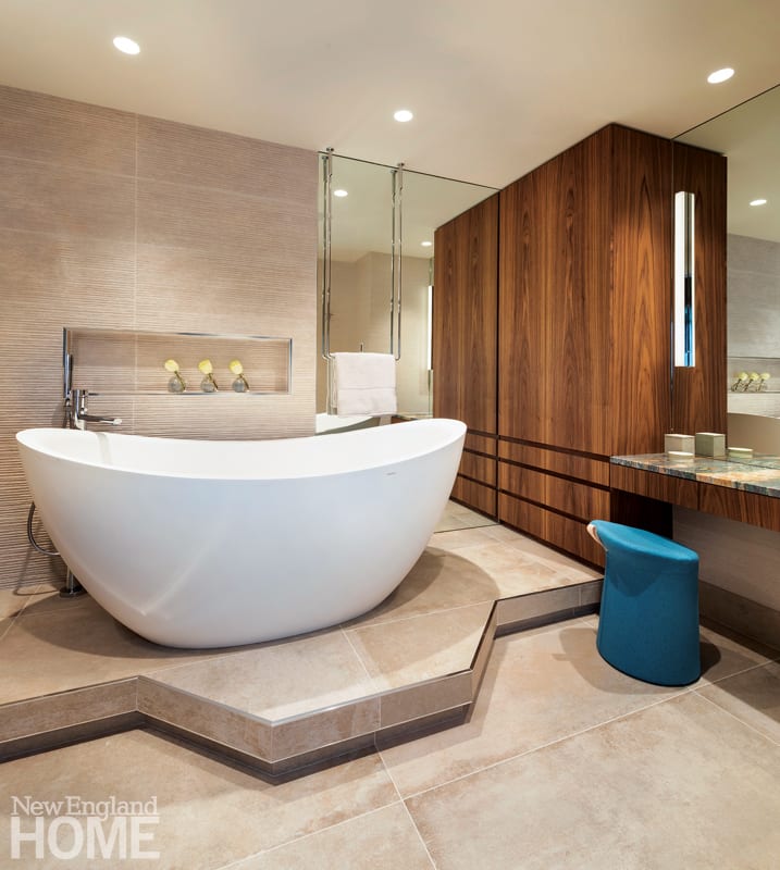 The project began with some demolition intended to create more open spaces, including taking down a wall between the kitchen and dining room and combining two bedrooms to create a master suite with a dressing room and Japanese-inspired soaking room. The latter centers on an oversize freestanding tub, specially sourced to accommodate the man’s six-foot-three-inch frame.