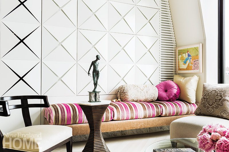 Move farther into the apartment and the main living area, as Tevolitz explains, “reveals itself.” Up soars the aura of light and the level of drama. An ingenious sculptural wall composed of a series of three-dimensional boxes with diamond-shaped edges angling out is at the heart of Ridruejo’s masterly composition. No mere attention-grabbing focal point, this glossy geometric wall serves a number of roles. Almost magically, some cubes slide open, allowing access to a stunning dry bar; others swivel lazy-Susan fashion to expose the TV.