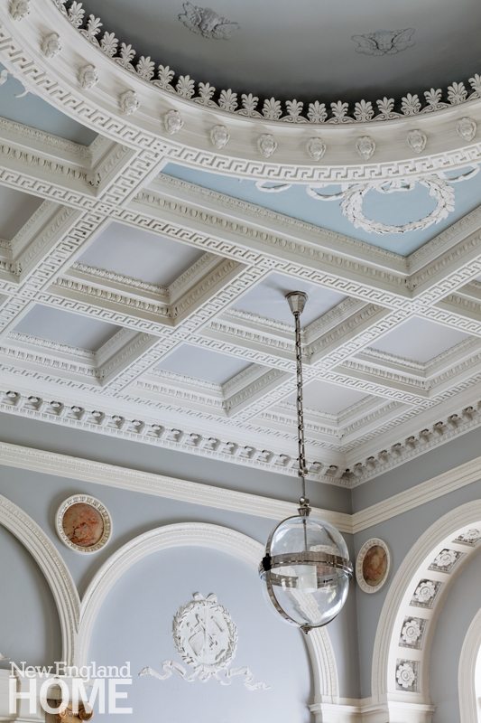 The music room—a special space for this music-loving family—was particularly elaborate. With intricate plasterwork, marble columns, an ornate coffered ceiling, and art glass windows, it barely needed furniture to make a statement. The blue and gold paint on the walls and the angels and clouds on the ceiling were, however, overwhelming. “The molding is so beautiful, all the detail is there,” Tress-Balsbaugh says. “Why gild the lily?”