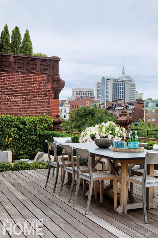 A few steps away, doors lead to a roof deck designed by landscape architect Jacalyn Gould. Built on two levels, the deck offers both a dining area and comfortable seating around a gas fire table. Boxwood hedging and sculptural urns complement the building’s traditional brownstone balustrade, but recede from view without competing with the expansive views of the city. And here, just as inside the house, the furnishings are right at home with the splendor that surrounds them.