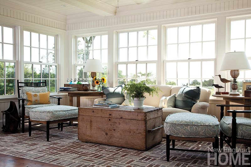 In the kitchen, bright blue mosaic tiles set off the cooking area. The secondary island, which frequently serves as a bar, is painted a seaworthy azure that might also, upon occasion, conjure congenial thoughts of Bombay Sapphire gin. Rather than a traditional dining room they’d seldom use, the owners opted to merge the kitchen with the dining area. Gregorius/Pineo rush chairs in a Mojave finish cluster about a Restoration Hardware table. The nearby sitting area sports an antique brick floor, a sly maneuver that leaves visitors with the impression that at some point a porch was reclaimed. An antique chest doubles as a coffee table, while demi-lune tables and Charles Fradin chairs flank the sofa.