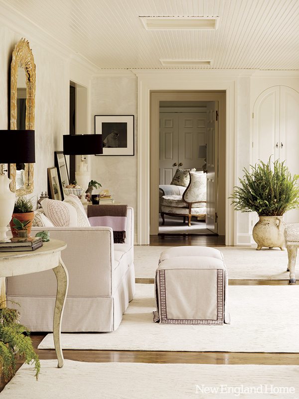 “My image book is inspirational photos—typically nature pictures—that I cut out of magazines.” • First up in her book: pages of mushrooms in all their muted glory—silvers, grays, bronzes, black, and shades of white from pure and snowy to tinged with earthy tones. “I’d never seen anything so beautiful,” James says. She decided then and there that those hues would form the basis for her interior design. • It fell to Karen Quinn to transform that inspiration into reality. Having worked with James on several previous homes, the West Cornwall–based designer already had a good feel for what would make her client happy. “This was our fourth project together,” she says. “We’re reading each other’s minds, finishing each other’s sentences at this point.” • Lovely as the house was, the two women agreed it needed a decorative overhaul that would increase its intimacy and downplay its formality. They achieved the former by adding crown moldings to once-bare walls in some of the living spaces, and the latter by incorporating furnishings and fabrics with a contemporary feel.