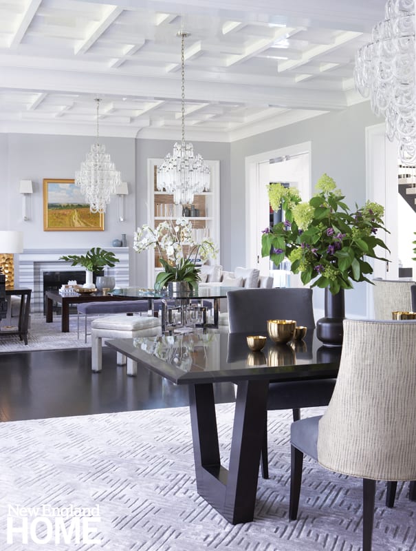 The elaborate ceiling design helps define the room’s distinct spaces, which Morgan Harrison reinforced with the use of rugs, furniture clusters, and a crystal chandelier over each space. Situated at opposite ends, the living and dining areas bookend the room with their matching gray, gold, and lavender palettes, their similar shelving, and their twin fireplaces crafted in striking Striato Olimpico marble.