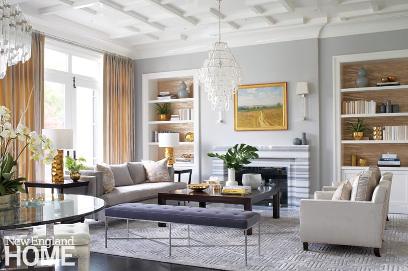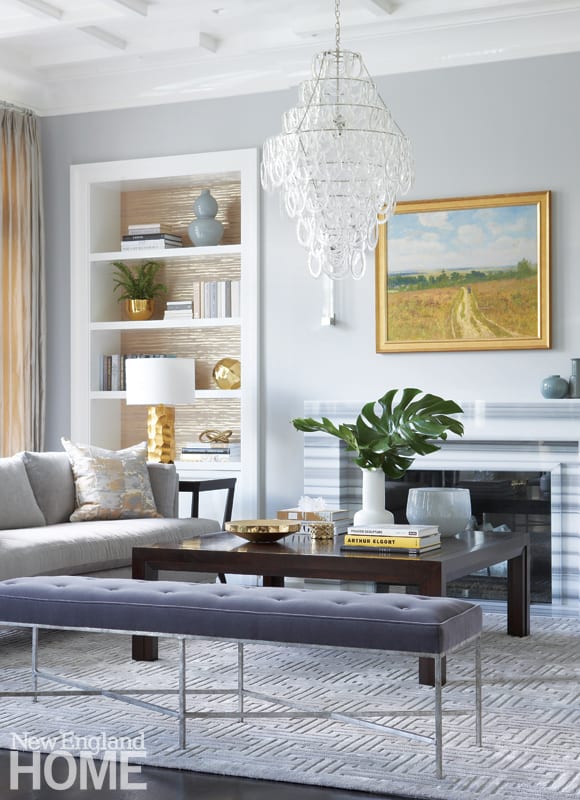 The glittering great room chandeliers are part of a lighting collection that includes Murano glass pendants in the entry hall, a chain-link chandelier over the front stair, and smoky glass globes clustered like grapes on the ceiling of the mudroom. “My original lighting presentation was much more modern, and then we dialed it back,” Morgan Harrison says. But the wife’s positive reaction to those contemporary pieces, the designer notes, “gave me a clue of where she was willing to go.”