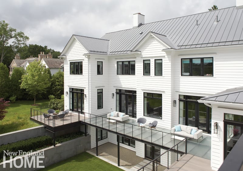 The home’s facade remains that of a stately clapboard colonial with dual chimneys and a center entry marked with a traditional portico. But the roof and window frames are metal, and traditional embellishments were discarded in favor of a simpler look. Jim Schettino points out how those substitutions and subtractions add up to a very different house. “If we had put a wood roof on that house, put in white double-hung windows and a more classical corner board and shutters, it would have morphed into a classical, symmetrical colonial,” he says.