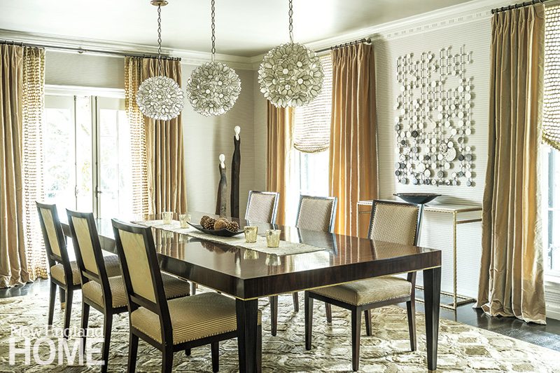In the dining room, a glamorous tri-pendant chandelier sets the stage for an opulent yet welcoming setting that accommodates casual dinner parties and festive holiday gatherings with equal ease. Once again juxtaposing disparate textures for impact, Palumbo dressed the room’s original horsehair-plastered walls in a wash of pleated linen, lending dimension that is further underscored by a new, silvery metallic finish on the room’s ceiling. A clean-lined rosewood dining table surrounded by sleek chairs sits on a Kyle Bunting cowhide rug that punctuates the setting with a relaxed, informal note.
