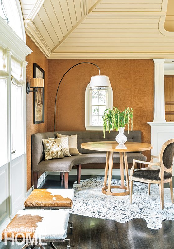 The breakfast room opens to the new family room, a two-story space featuring a ceiling detailed with horizontal wood banding, a nautical reference in homage to the naval background of the home’s original owner. Again deftly blending contemporary and traditional, Palumbo chose a tawny leather wall covering by Ralph Lauren as a backdrop to the stone fireplace with its dramatic soaring chimney breast, and outfitted the room with highly textured, oversize furniture for maximum comfort. An upholstered banquette tucked into a corner beckons the kids for game-playing and homework.