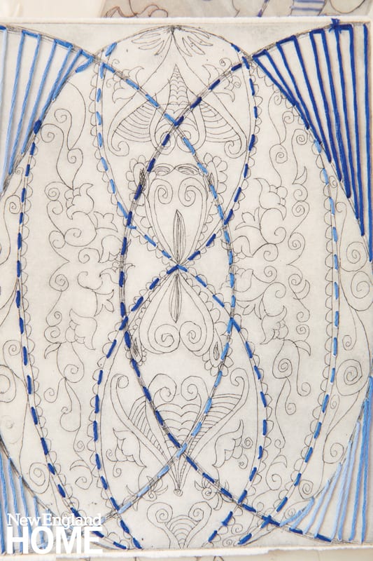 Sayeed utilizes a printing studio in Watertown, Massachusetts, to do the gritty job of cutting copper plates to create her engraved and layered intaglio prints. Her design studio in Newton, Massachusetts, has a more relaxed vibe, despite doubling as her painting studio. On the walls hang paintings appended with prize ribbons. Her former dining room table serves as a catchall for fabric samples and prints.