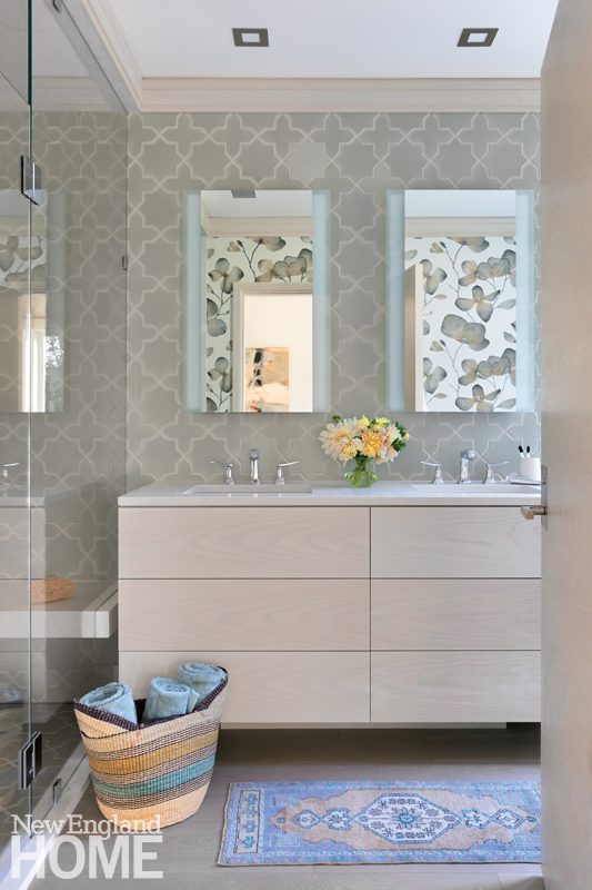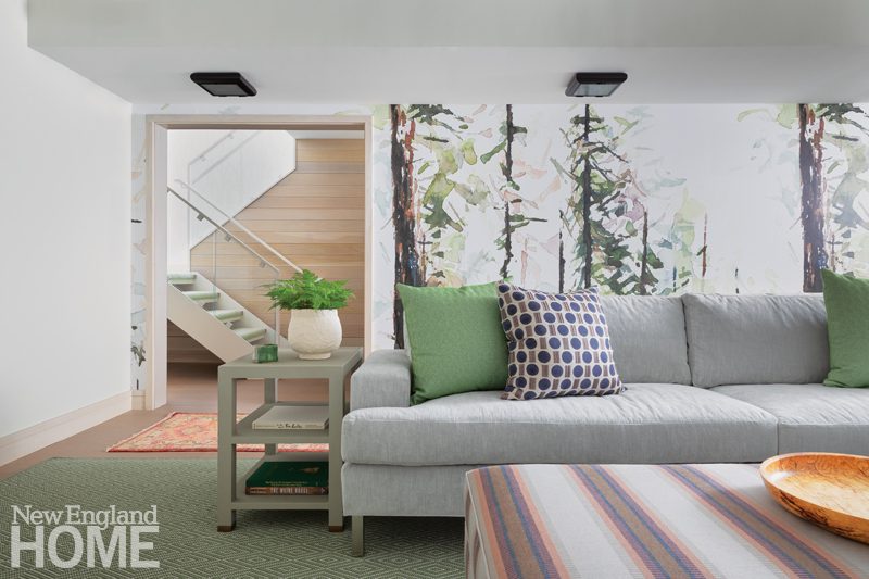 Dwyer rejoined forces with the creative team behind the main house: Pittsburgh-based interior designer Betsy Wentz and Maine-based landscape designer Emma Kelly. They determined the interior palette early on. “We wanted green to be the thread throughout,”says Wentz, “because it brings in nature. We’ve got pretty much every shade of green covered in this house.” Known for her vivid eye-popping palettes, Wentz also added what she calls her “color stamp” to barstools (individually upholstered in lavender, pale blue, and green) and toss pillows and in subtle patterns that show up on wallpapers and strategically placed chairs.