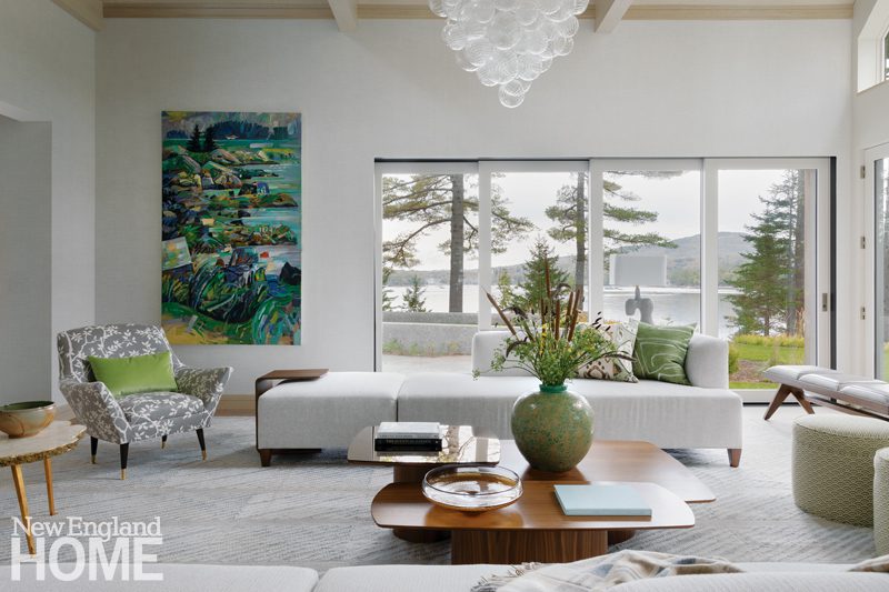 In the main house, Dwyer’s dramatic fireplace required some tricky engineering. The team hung a steel frame from the living room’s ridge beam, then faced it with plywood and affixed thin slabs of engineered stone from Cambria. The design allows for a view through the flames to a fern-shrouded terrace—and from the terrace into the living room. A thoughtful collection of Maine artists provides the guesthouse’s exclamation point, making it feel like a home away from home and providing plenty of conversation starters for all those soirees.