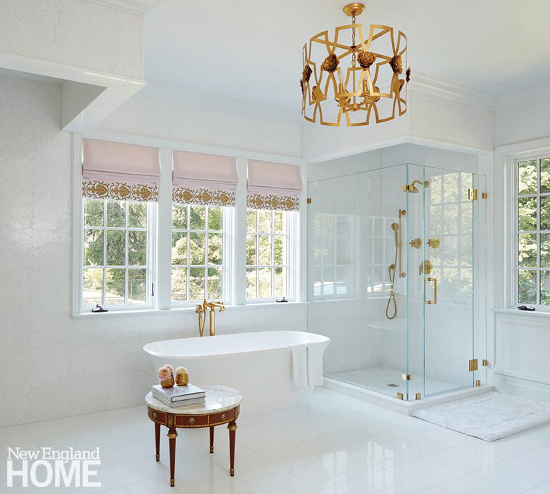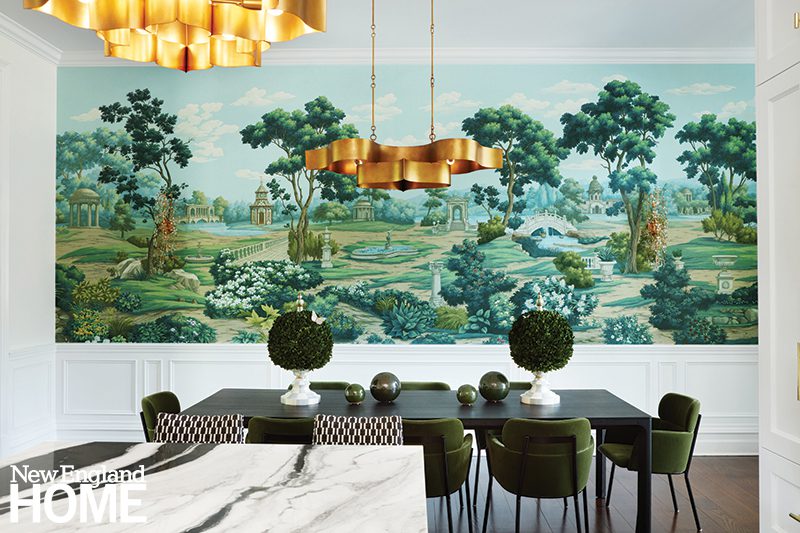 “I originally wanted a British racing-green kitchen, but the space doesn’t get much natural light,” explains the client. “We went with white cabinetry instead, but incorporated glamorous elements like marble with intense veining, floral-shaped lighting, gold accents, and a scenic mural that brings the outside in.”