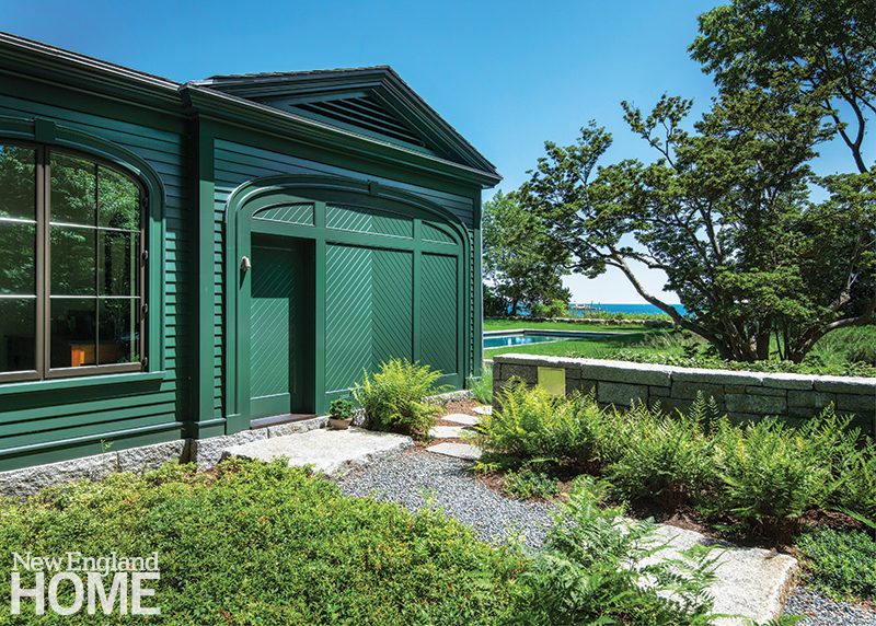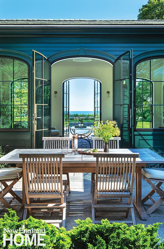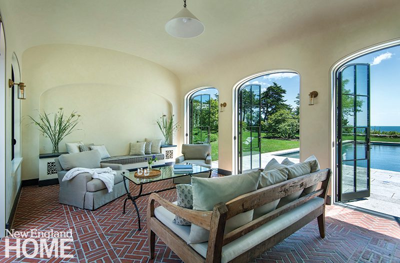As for the 1,000-square-foot pool house, architect and interior designer Catherine Truman opted for what she describes as “a modest building that defers to the landscape,” taking architectural cues both from the gardens themselves and the property’s historic structures. Arches in the pergola, a garden shed, and outbuildings, all designed by Olmsted, are reflected in the design of the pool house doors and windows. The structure was sited to preserve a pair of ancient trees and, of course, the ocean view.