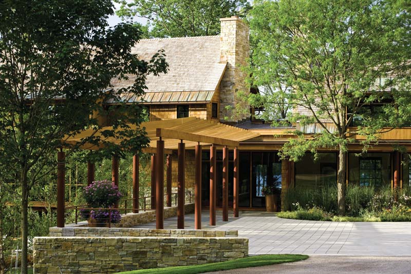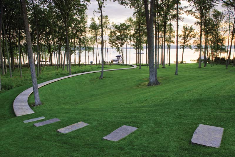 The grounds slope down through wetlands to the lakefront, so Wagner designed a gently curving cedar boardwalk to protect that fragile part of the property. The house and landscape elements complete a graceful sweeping arc that starts at what Grutchfield describes as “the prow” of the house, continues along a curved South Bay quartzite stone wall, then down bluestone stepping stones and finally onto the boardwalk itself. The arc, Grutchfield says, “is a soothing and welcoming gesture, like opening up your arms to the lake.”