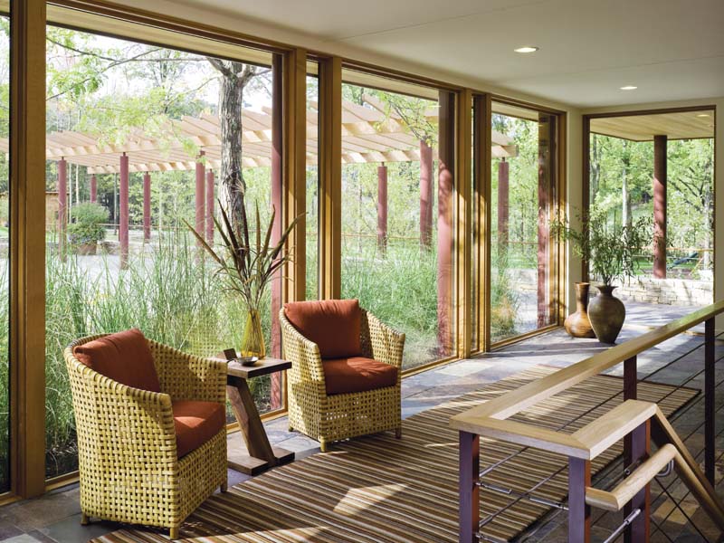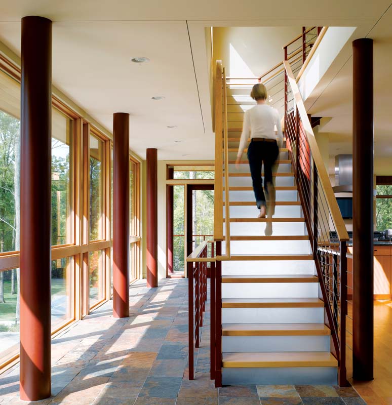The Crowes also asked about changing the color of the steel posts inside and outside the home. “Originally they were black, and we thought they made the home look too severe, too contemporary,” remembers Jeff. Grutchfield had them repainted an earthy Indian red, and admits he’s glad his clients suggested the change.