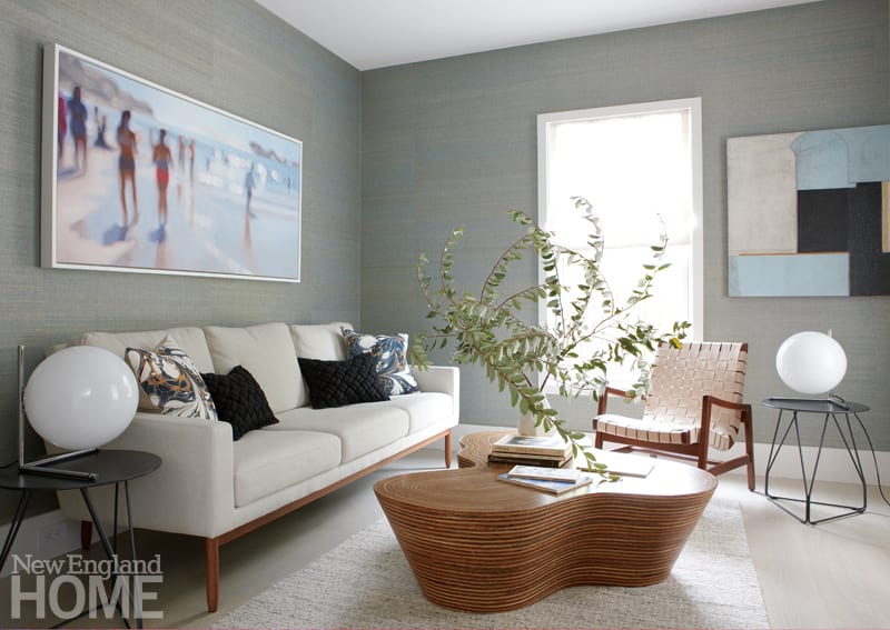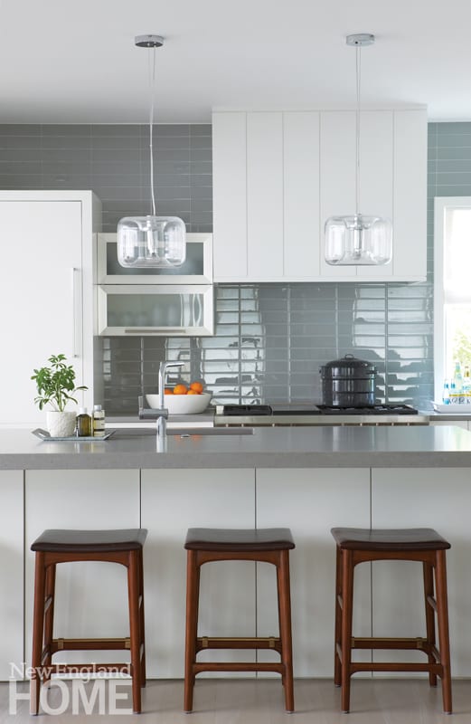 As effortlessly as the tide, the dining room flows into the kitchen, which, with its fog-colored glass tiles and Caesarstone counters, flows in turn into the living room. To downplay the kitchen’s role as a workplace, Cutone designed a large pantry and loaded it with all the necessities any cook could want, from a bounty of storage to an extra dishwasher and sink. Thanks to this well-equipped auxiliary space, the kitchen, with its Ligne Roset pendants and waterfall island, maintains a sleek demeanor no matter how big the occasion nor how numerous the company. “Messy dishes and such are whisked out of sight,” Cutone says.