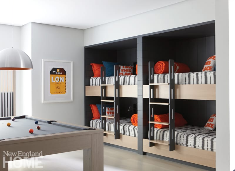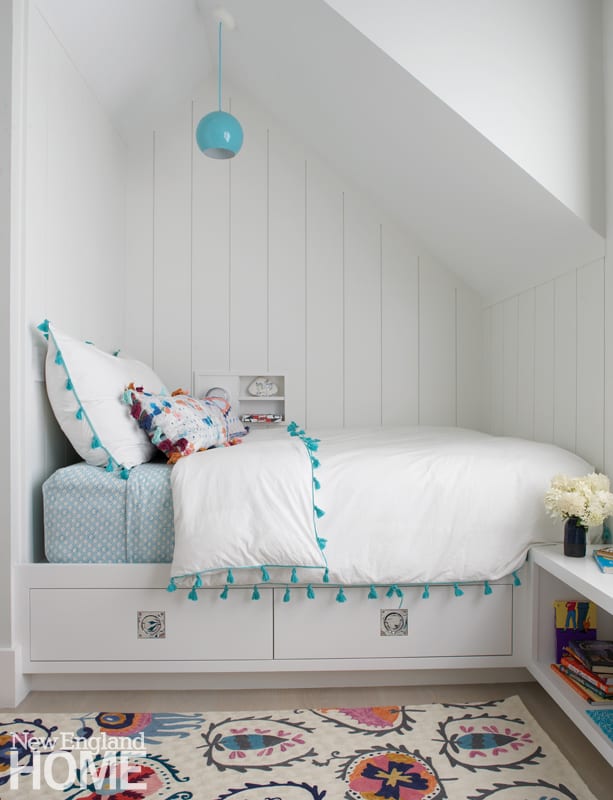 Eventually, when the fire and the candles have dwindled, everybody wanders off to a stylish bedroom. In the second-floor room shared by two of the girls, parallel built-in beds (all the beds were designed by Cutone) are tucked beneath the eaves. To up the feminine ambience, Sterk covered the boat-like berths with tassel-festooned linens. A rug with a lively pattern and sophisticated colors “will remain appealing even for teenagers,” the designer says.