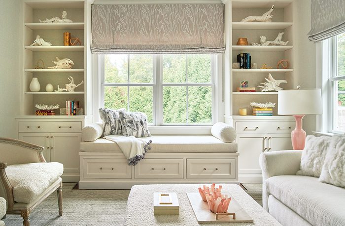 A soothing palette and luxe aesthetic bring a sense of peace and quiet to a primary suite and sitting room.