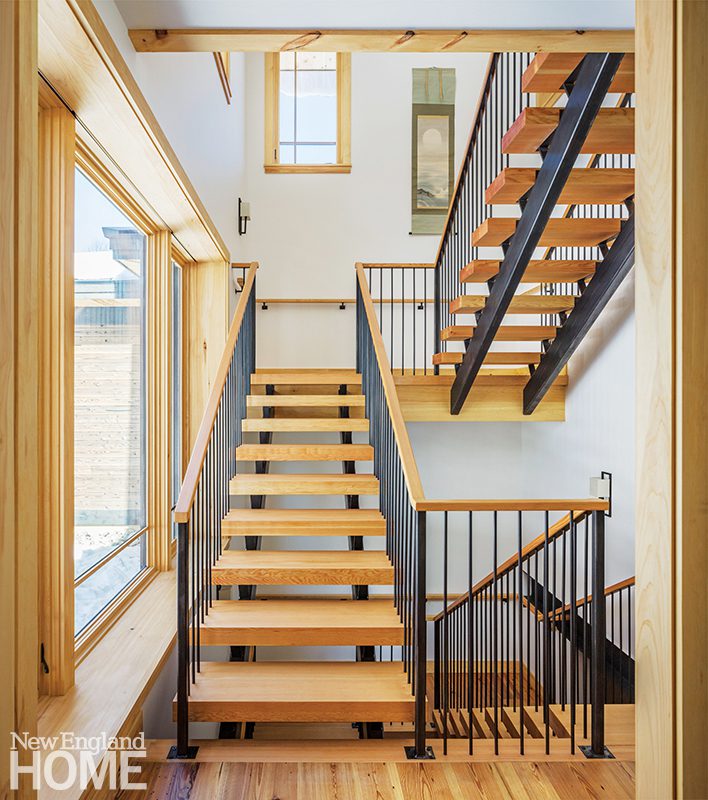 Inside, salvaged heart-pine flooring with plentiful patina and locally sourced pine millwork create an enveloping woodsy feel. “Pine is not considered a fancy material, but the flooring was extremely well crafted—and locally harvested,” Quinn says. “We also used a custom pine veneer on the Topakustik ceilings, a sound-absorbing wood out of Switzerland.” The latter helps create a quiet environment in a home with a lot of hard surfaces—and it actually works. “It’s not a gimmick. We’ve used it in a number of projects, and it’s extremely effective,” Quinn notes. “These are people who like to have dinner parties routinely, so it’s important to be cognizant of how the house is going to perform.”