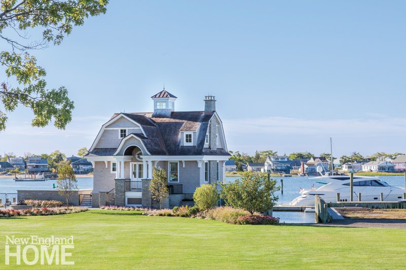 The land side has a more formal look, with a gambrel-roofed dormer and entry that echo the roofline. A flagstone terrace, fieldstone pillars, and a low fieldstone wall ground the house firmly to the site. Low-maintenance, sun-loving plantings edge the terrace and provide pops of color.