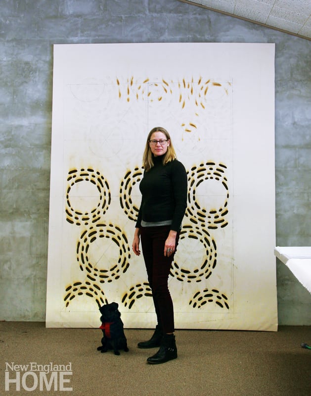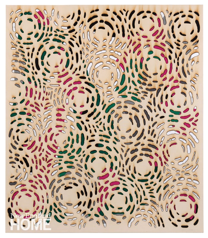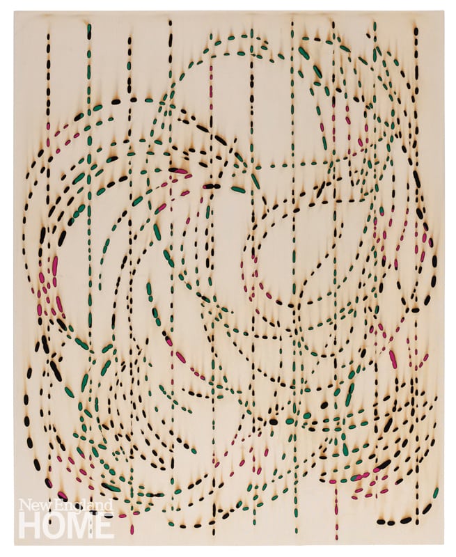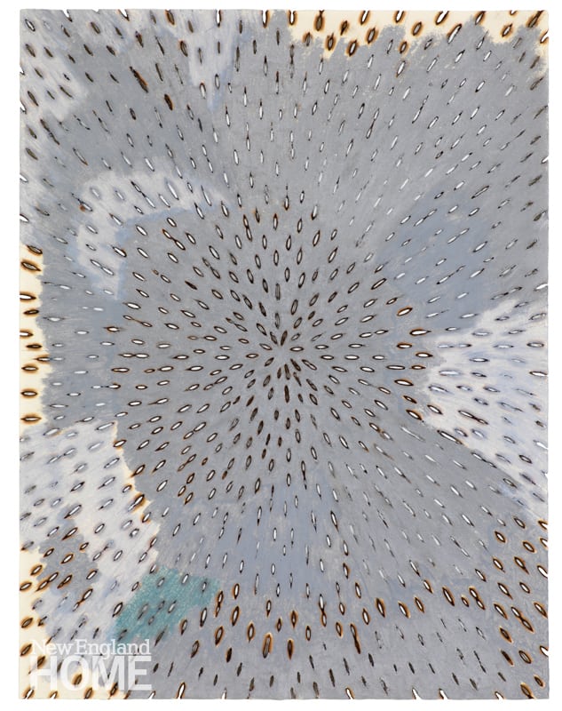 Taking a break from a work in progress—a ten-by-eight-foot canvas—in her expansive mid-nineteenth-century barn/studio near the Litchfield County settlement of Falls Village, Kucka explains how she burns a series of semi-solid concentric circles into the canvas. “It’s really pretty basic,” she says as she shows off an electric fire starter with a loop-shaped heating element. “It’s the same thing people use to start their outdoor charcoal grills. I used to use a hotplate, a butane torch, or an iron, but I found this to be much easier—and safer.” She uses water to help control the size and shape of the burn.