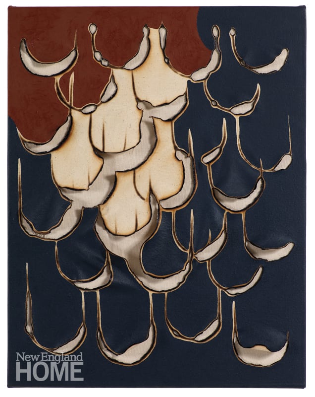 Typically, she will scorch a canvas in her Connecticut studio and bring it to her Brooklyn studio, where she may add paint or layers of fabric to finish it. A work can take anywhere from a few days to several weeks to complete.