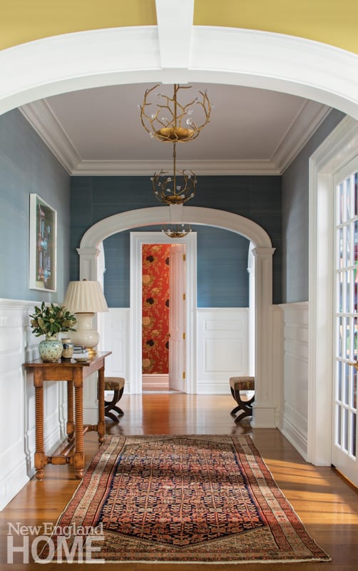 Tempered jewel tones are used strategically on the main floor, with each room sporting a splash of color from the adjacent room. “It’s a way to prepare people’s eyes for what’s to come without them even realizing it,” says Walsh. Perhaps the most dramatic spin of the color wheel took place in the library, where Walsh painted the existing cherry paneling a vibrant high-gloss blue.