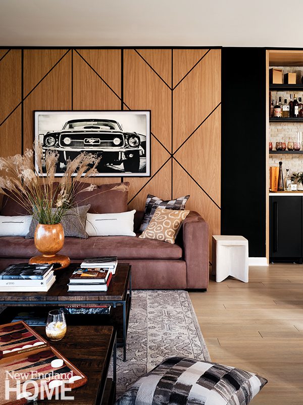 The eighties isn’t the only era to make a star turn. Burke skillfully incorporated a midcentury modern bent that appears in everything from the wood paneling in the living room to the black-painted kitchen cabinetry to the Visual Comfort & Co. light fixture above the dining table. The industrial and linear aspects of the design are also a subtle nod to Djiounas’s family’s manufacturing company, notes Burke.