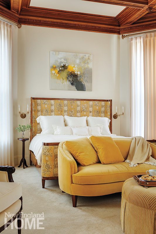 The master suite’s decor most definitely evokes the same keep-it-airy feeling. “This room was once a library,” says Skaletsky. “We wanted it to have the tone of a presidential suite in a fine hotel.” And, certainly, even the room’s approach, a hall with gleaming, lacquered walls for one more light-infusing touch, has that. The custom walnut bed upholstered in dreamy yellow toile, the velvet love seat, and sensory-pleasing wool-sateen drapes make for a luxurious environment. It’s the kind of room where the lady of the house, on those rare occasions when she has time, might happily relax with a cup of tea.