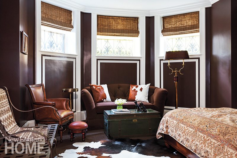 Guests invited to spend the night are in for a charming surprise. Their cozy quarters, along with a library and an office, are located on the ground level. Inspired in part by the wife’s fondness for Ralph Lauren’s classic style, Skaletsky explains, these rooms have a personality all their own. Walls are painted a rich, glossy brown as a backdrop for an array of time less furnishings, including a handsome leather chair, an antique French iron bench, and a cowhide rug. The guest bath follows suit, with Nina Campbell’s elegant Lomasi wall covering depicting sprigs of fluffy lilac against a chocolate-colored background.