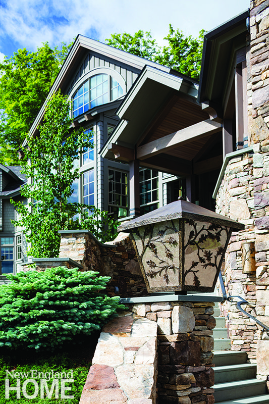 At the top of the steps, guests are welcomed in a reception loggia with a fireplace and views of the front property, designed by landscape architect Raymond J. Smith Jr. Smith used plantings to screen the house from ski trails, but also, he says, “to retain the marvelous views.” One of the striking plantings is a needled evergreen of various textures and colors that frames the left side of the stairs.