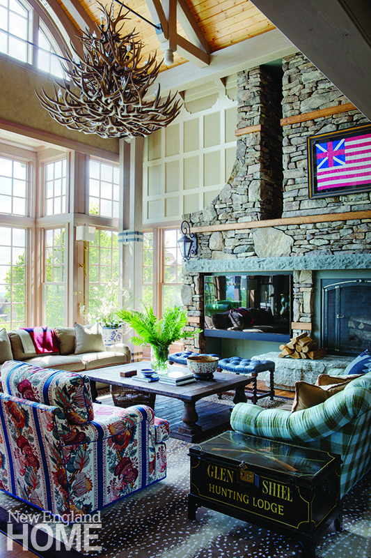 Classic, yes, but the great room also has bold overtones. Against the walnut floors and a twenty-eight-foot-high ceiling crowned with an antler lighting fixture, Thebault created a palette of neutrals sparked with colorful accents. A sofa and club chairs upholstered in Brunschwig & Fils fabric in vivid hues focus on the soaring granite fireplace and the breathtaking view. At the other end of the space, a bar demonstrates Thebault’s deft way of injecting daring touches into classic design. The shelving and light fixtures have a sculptural look embodied by glass and aged brass, while a pair of lamps fashioned from nickel rest on the bar of serpentine from a Vermont quarry. The barstools wear vinyl, chosen for minimal worry about messes by children or dogs.