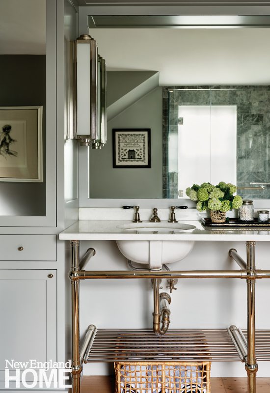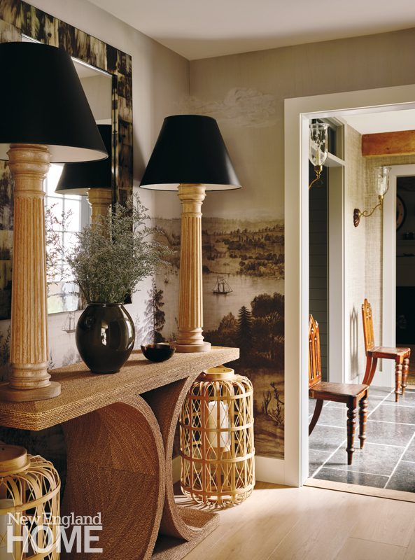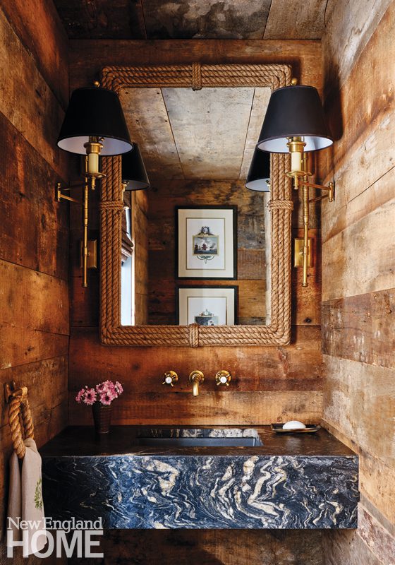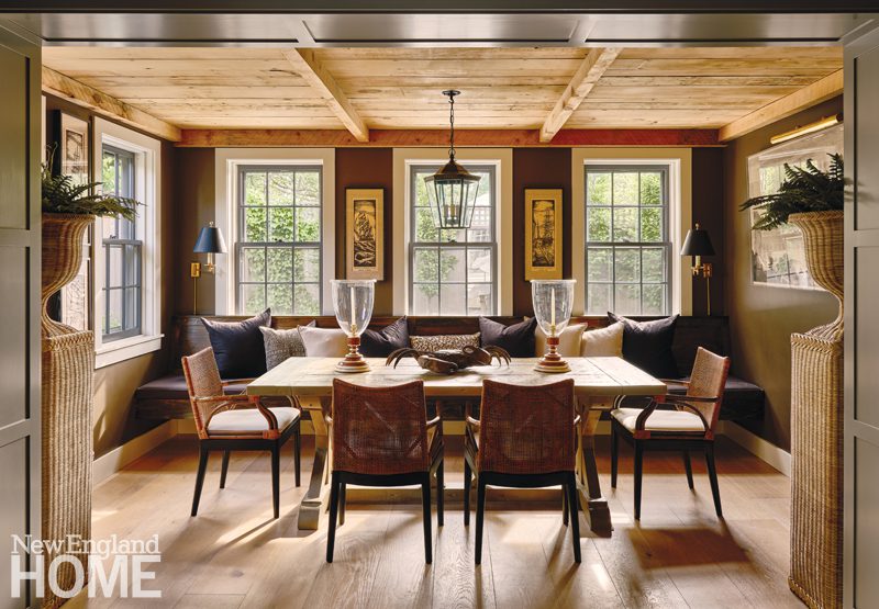 Paton found ways to repurpose elements from the addition that had to be rebuilt. Interior doors, for example, became a dining room banquette. Leftover pine sheathing clads that room’s ceiling and the ceiling and walls in a powder room. “Our goal was to honor the history of the house and even enhance it with the appropriate furnishings and interior details without making it feel like a museum,” says Paton. “We wanted to celebrate what is and what was.”