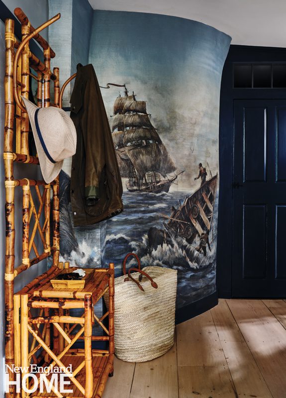 For instance, take the chimney that helps support the entire structure. Seen from the foyer, its barrel shape and plaster texture were, frankly, an eyesore. Paton saw it as a creative challenge and solved it by printing a whaling mural by local artist and designer Audrey Sterk on sisal; it wraps the chimney and acts as an instantaneous conversation starter when guests walk into the home.